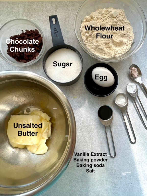 As the name healthy suggests, I am sure you guys figured out that this recipe is free of refined flour and refined sugar. To make the recipe, you will need the following: chocolate chips or chunks, wholewheat flour, baking soda, baking powder, pure vanilla extract, salt, sugar, unsalted butter, and egg.