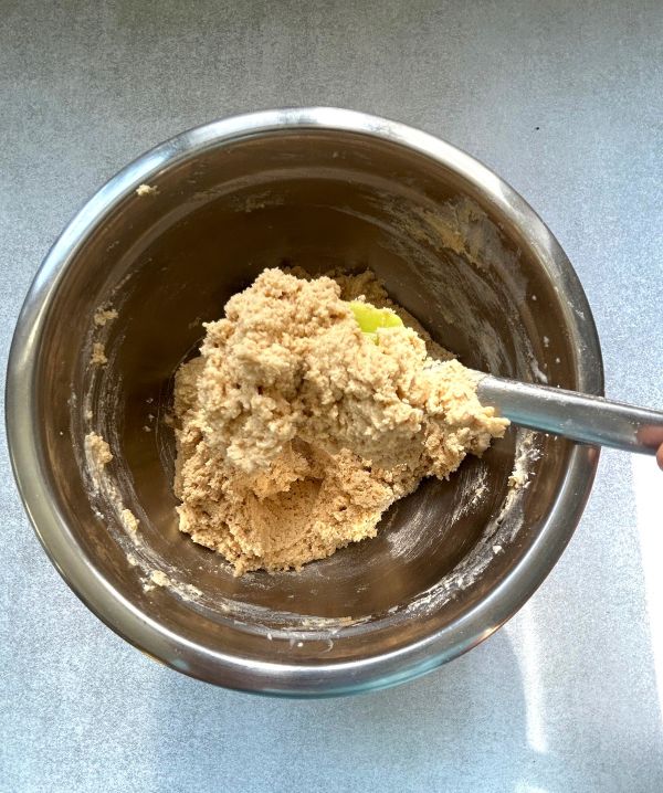 4. Now add the dry ingredients in batches. Keep mixing with a spatula. Do not touch or knead the cookie dough. Just bring it all together.