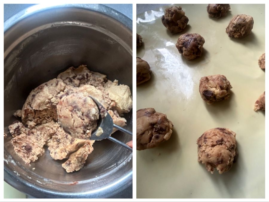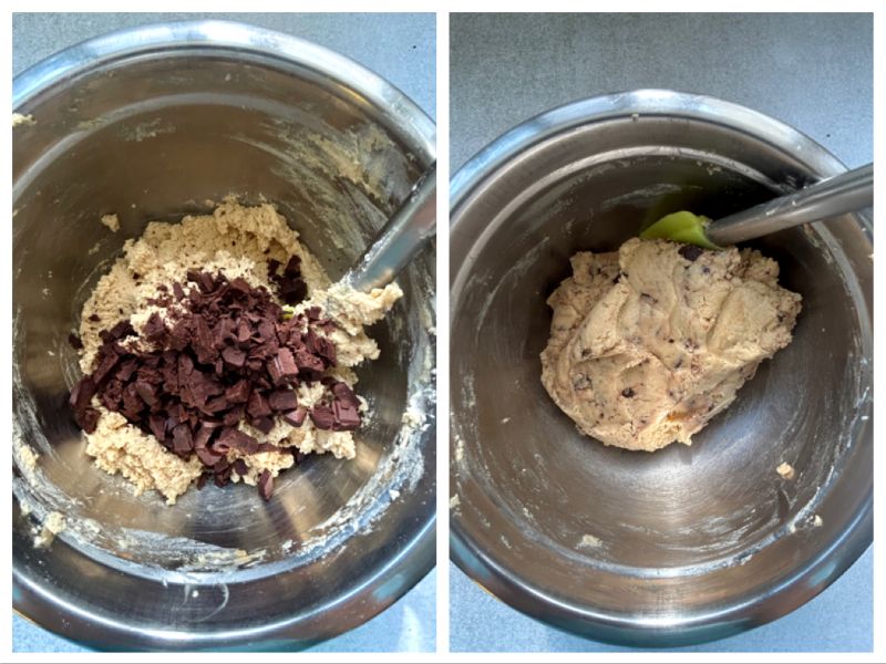 5. Add in chocolate chips or chunks and gently fold in the cookie dough. Your cookie dough is formed.